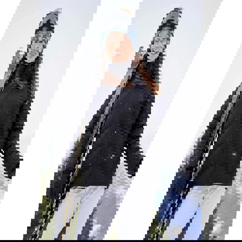 This women’s Cairngorm ski jacket from Mountain Warehouse is made with a polyamide and polyester shell and a 100% polyester lining. The fabric has a baffled construction and a hooded neckline for added coverage.