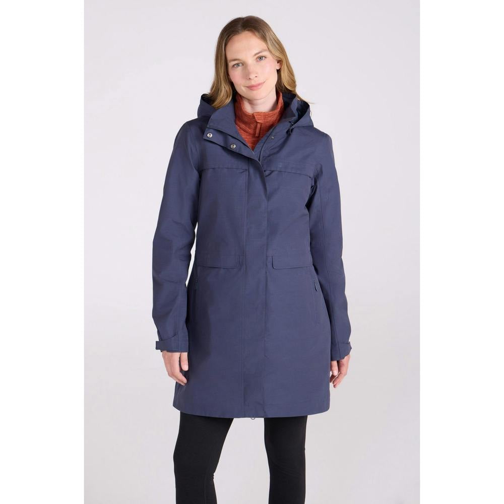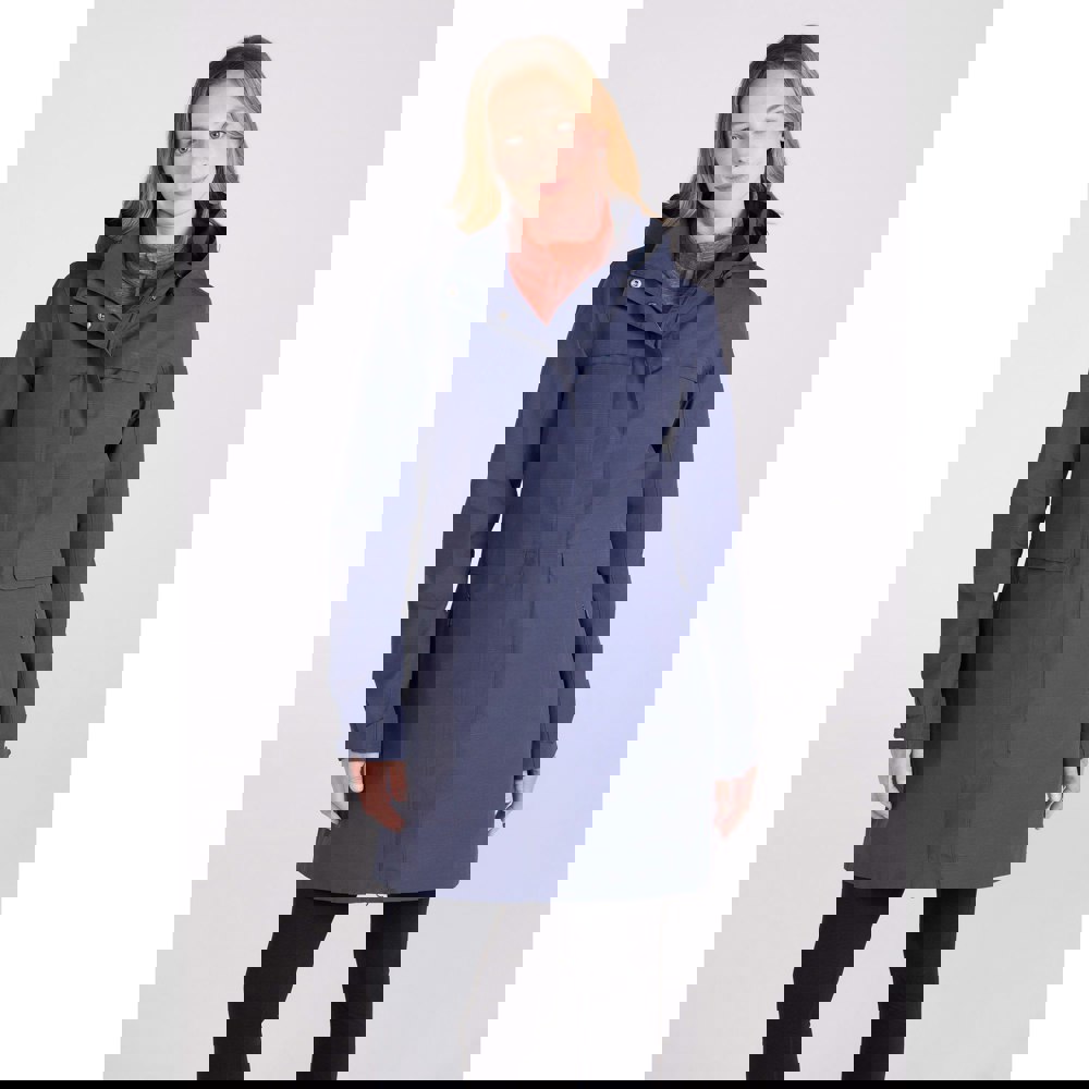 This long women’s jacket comes in navy with a textured finish and logo detailing. It has a hooded neckline with an adjustable grown-on hood, plus long sleeves with adjustable cuffs. A full zip fastening is covered by a stormflap and secured with press studs.