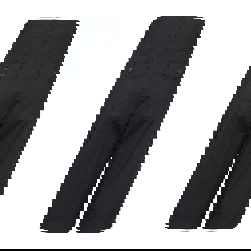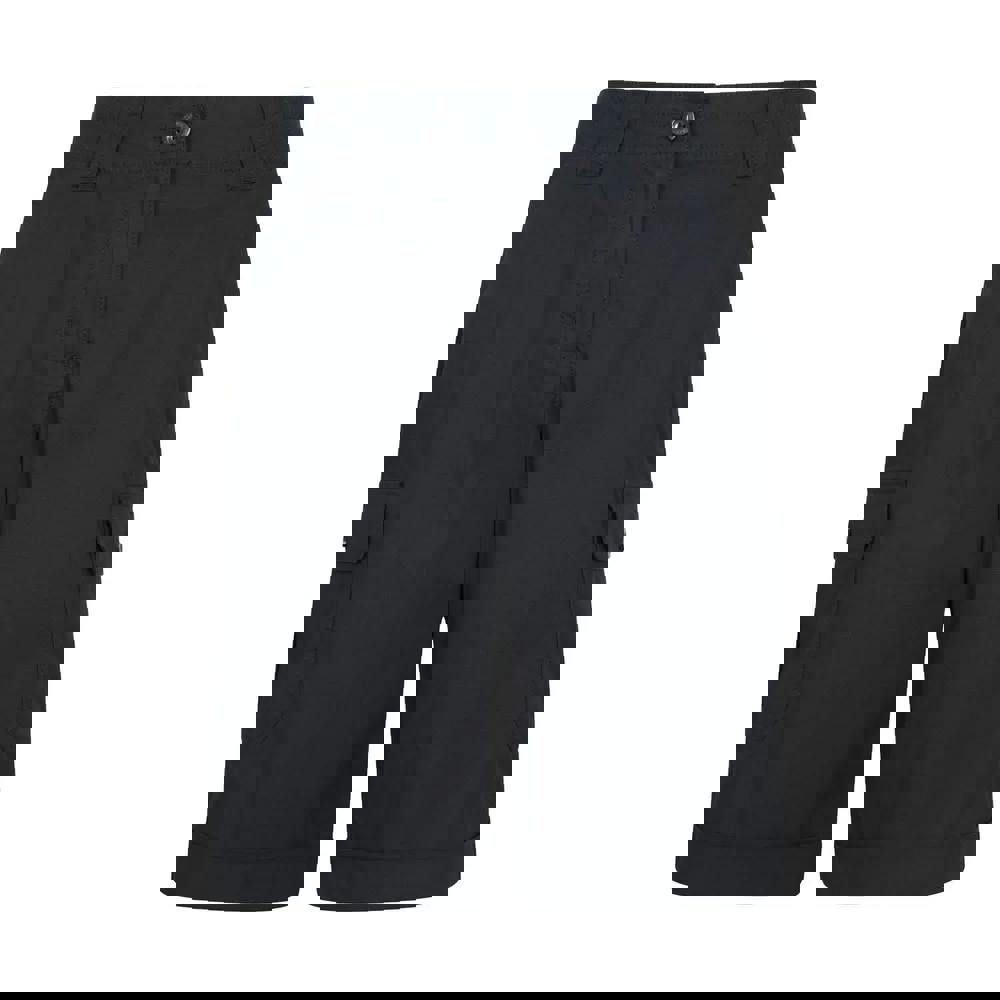 Practical storage comes from a combination of side and thigh pockets. The thigh pockets have flap closures with button fastening. Belt loops and a turn-up hem complete the design, and the front closes with a button and zip fly.