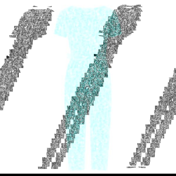 This wrap jumpsuit comes in teal with a crane and floral design. It has a deep V neckline with a wrap front and short sleeves, finished with a cropped ankle length. The lightweight construction keeps the look clean and easy to wear.
