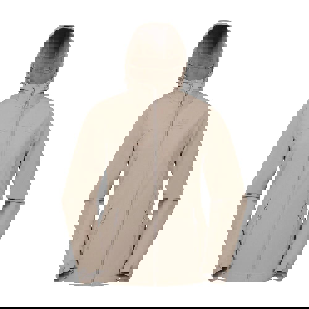This softshell jacket is made from polyester and elastane, finished in a plain dark beige with a logo detail. A hooded neckline and long sleeves create a practical outer layer for everyday wear, while the full zip fastening includes a chin guard for added coverage.