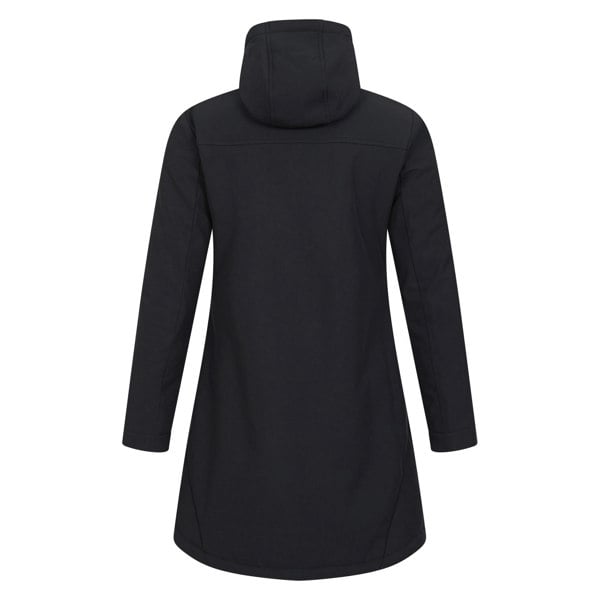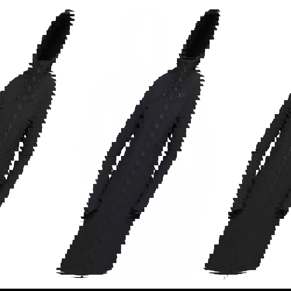 This longline soft shell jacket is made from woven fabric and finished with a soft lining in faux fur and fleece. It has a plain design and a hooded neckline, with a drawcord at the hood for adjustment. Long sleeves are finished with hook and loop strap cuffs.