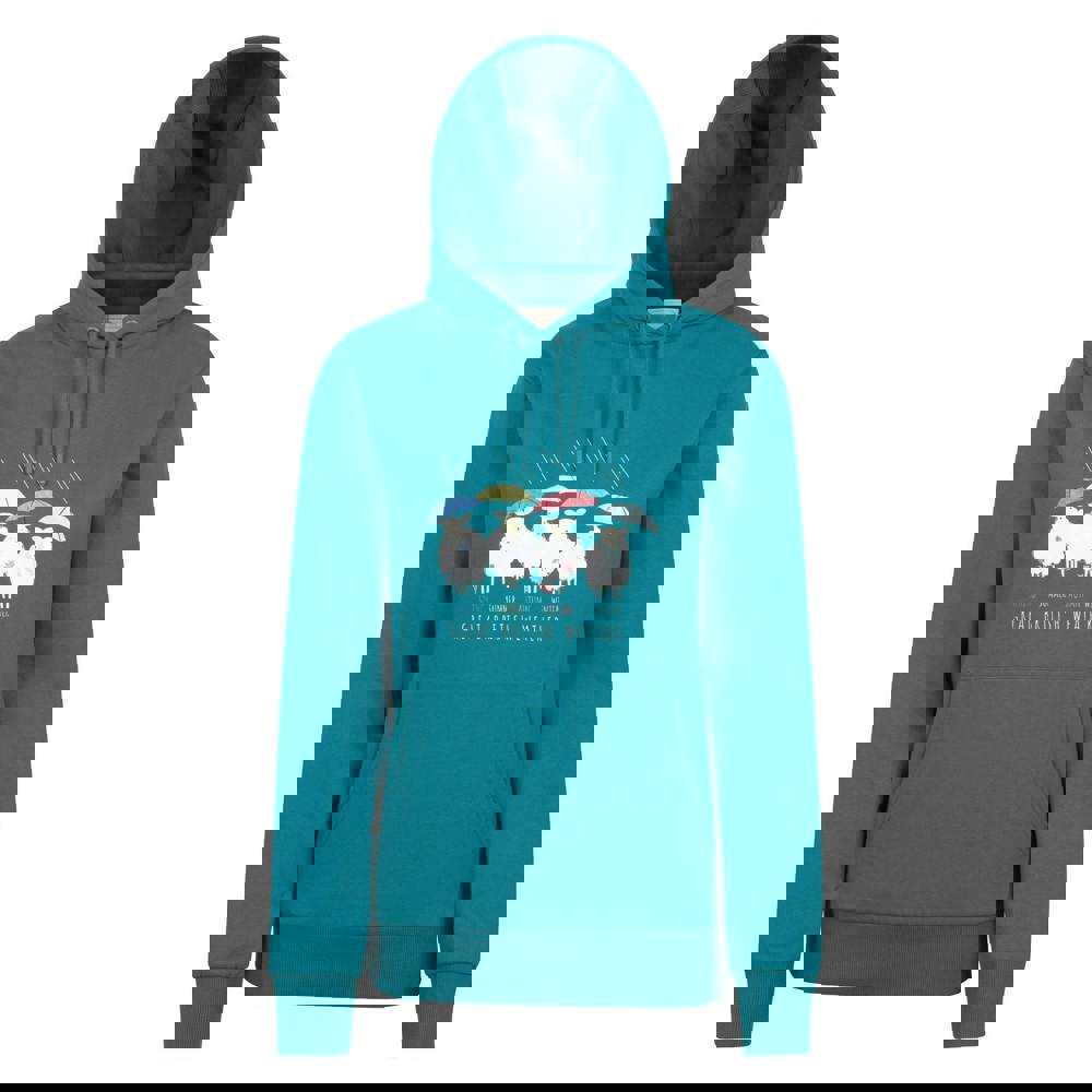 The hooded neckline includes a sew-on hood with an adjustable drawcord. A graphic print adds character, combining rain, sheep, text and umbrella motifs. Long sleeves are balanced with fitted cuffs and a fitted hem, while a single kangaroo pocket keeps the front clean and practical.