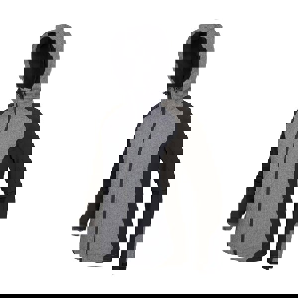 This women’s soft shell jacket is made with a bonded fleece fabric and a shell blend of elastane and polyester, finished with a 100% polyester lining. It comes in black with a contrast design and reflective detailing.
