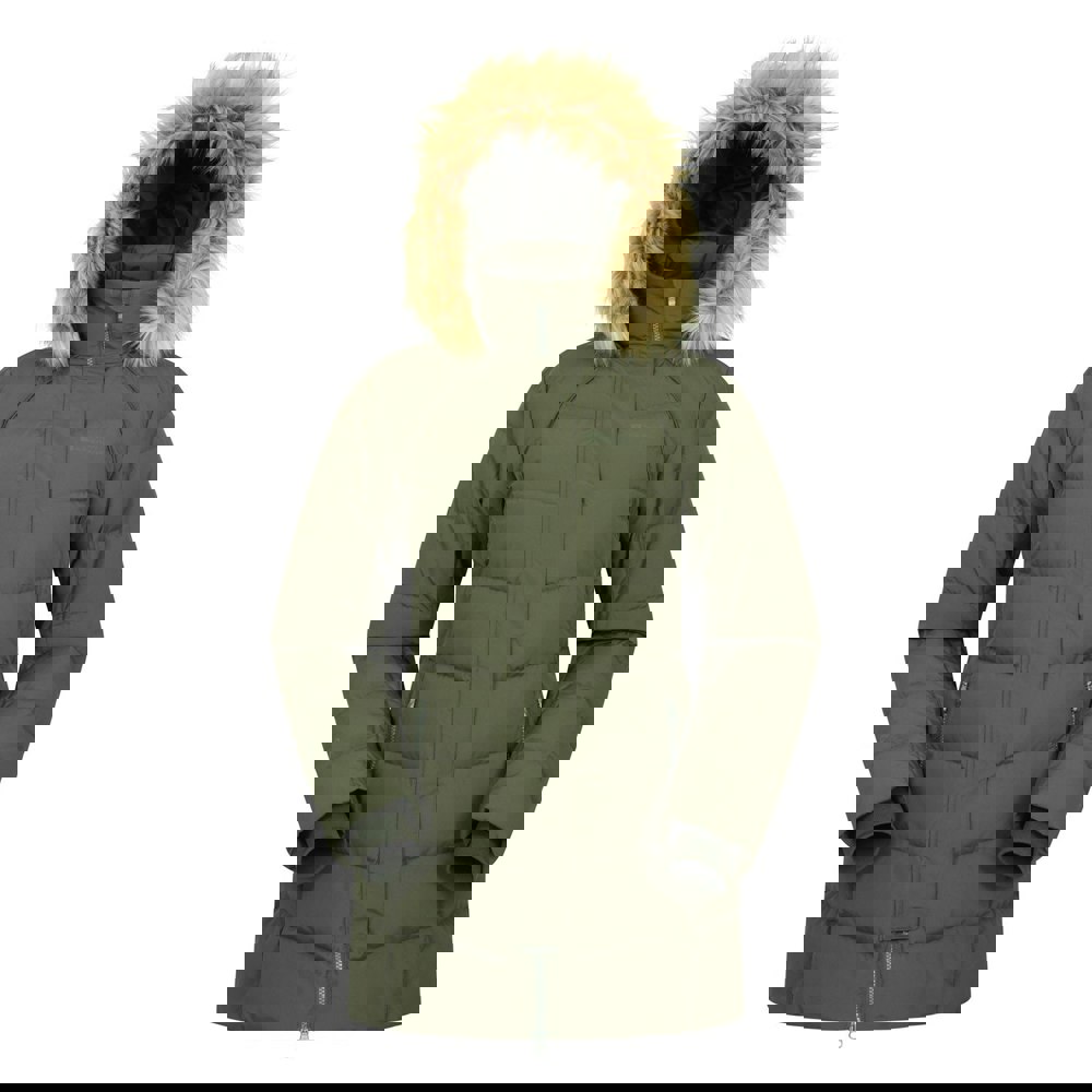 This long padded jacket is made with a 100% polyester outer and a downproof 100% polyester lining. The filling combines 80% grey duck down with 20% grey duck feather, with a stated filling weight of 600g. A DWR finish and water resistant fabric technology are specified.