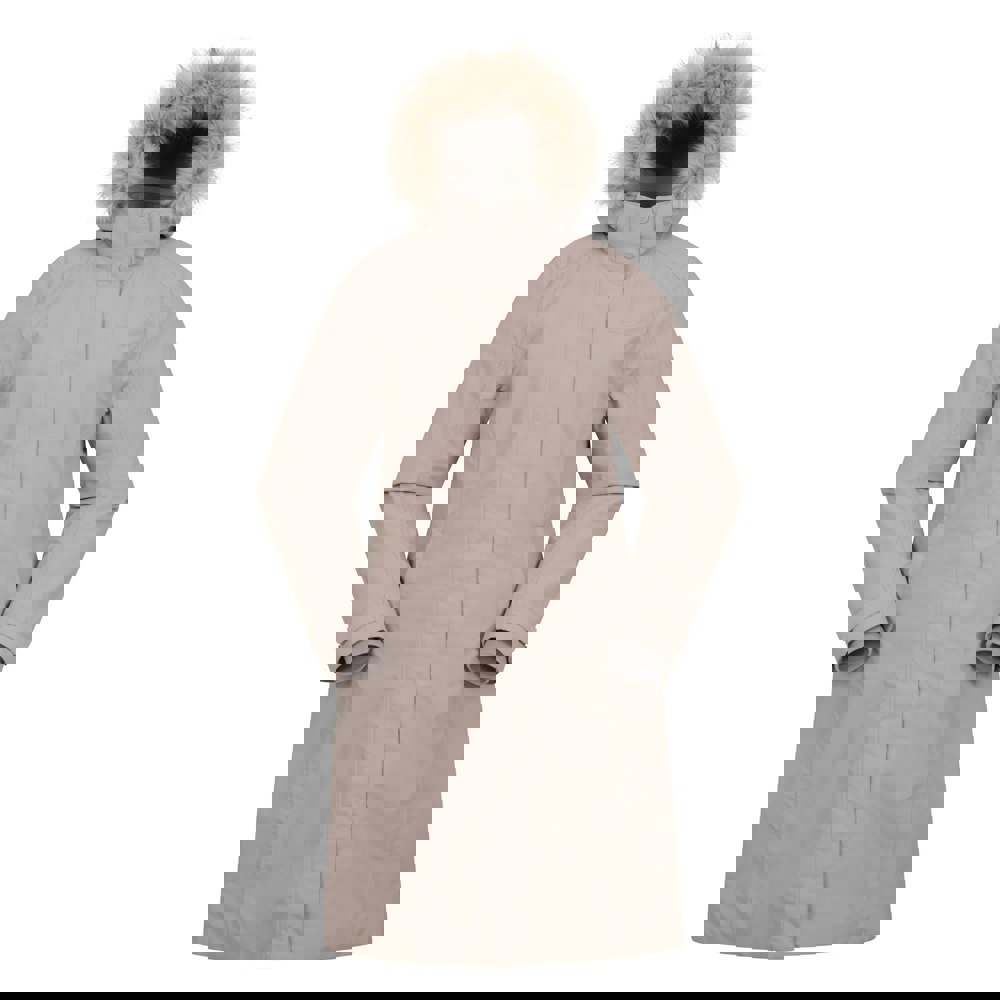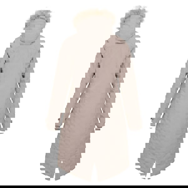 Built with a front zip and popper fastening, it includes two side pockets and long sleeves with adjustable wrist straps. The detachable faux fur trim is sewn on. Fabric technology includes breathable, waterproof and insulating properties, with a DWR finish, heat retention and a PFC-free construction. Waterproof rating: 5000mm. Breathability: 3000g/m²/24hrs.