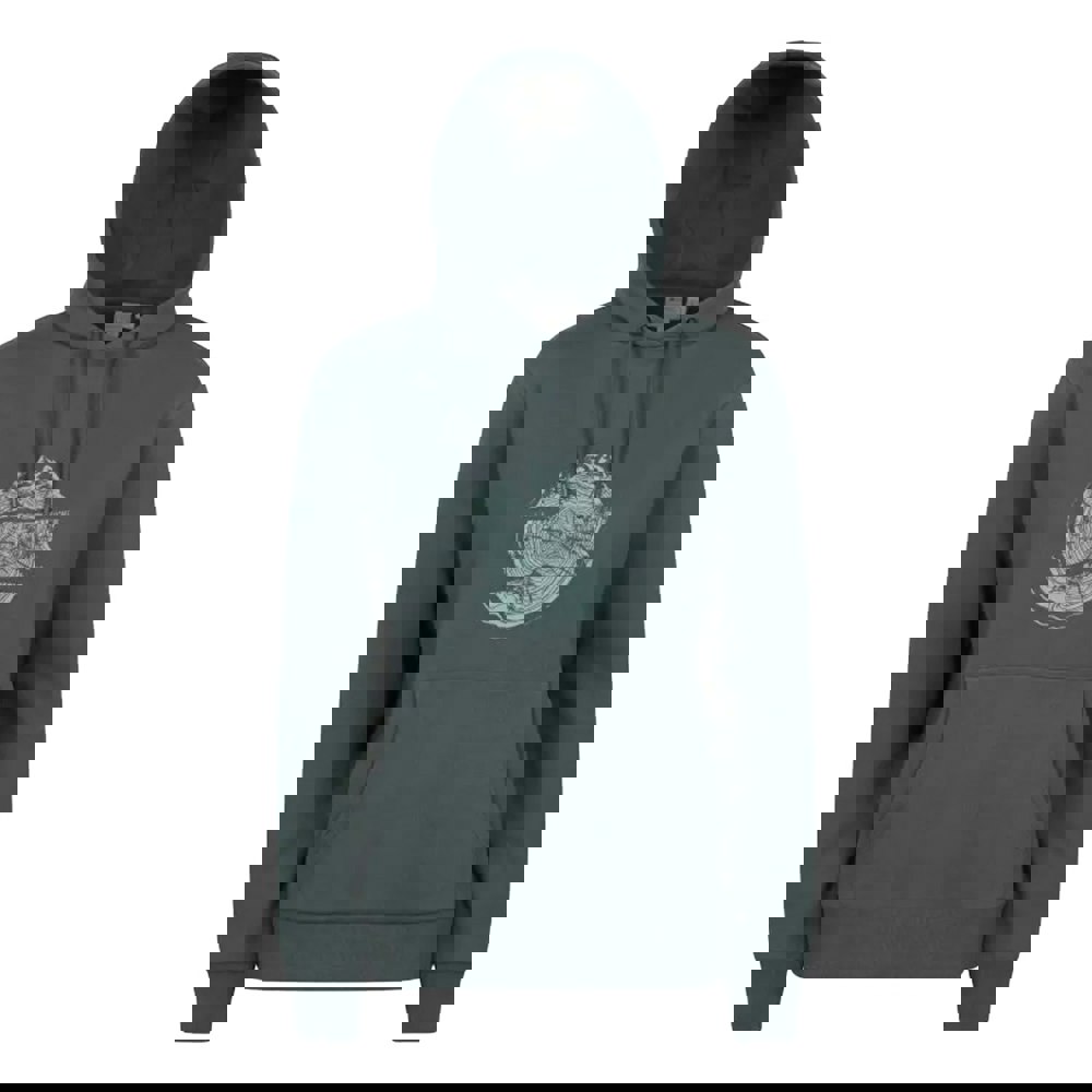 A mountain ring print adds detail to the outer, and a single kangaroo pocket offers practical storage at the front. Cut in a regular fit, it works well for everyday wear and layering.