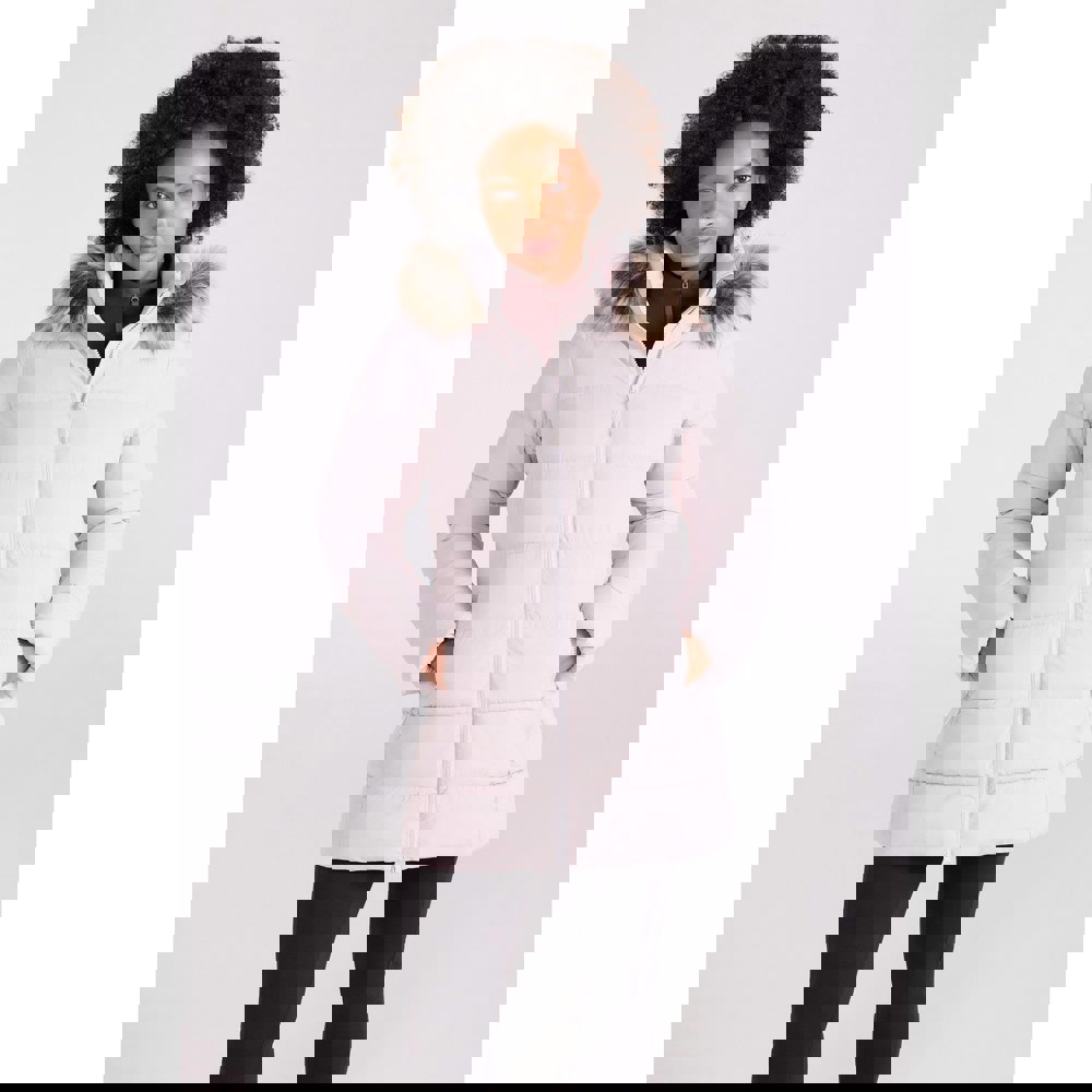The Nola long padded jacket from Mountain Warehouse is a light beige outer layer with a long length and long sleeves. It has a high neck and a grown-on hood finished with faux fur, plus a chin guard for added coverage. The jacket fastens with a full zip and includes two side pockets with zip closure.