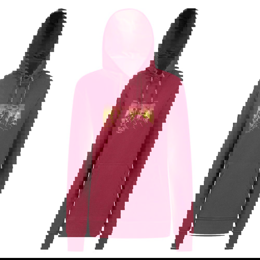 In burgundy, it has an ombre mountain graphic print and a classic pullover shape. A hooded neckline with an adjustable drawstring adds everyday practicality, while ribbed cuffs and hem provide a neat, structured finish. A kangaroo pocket completes the front.
