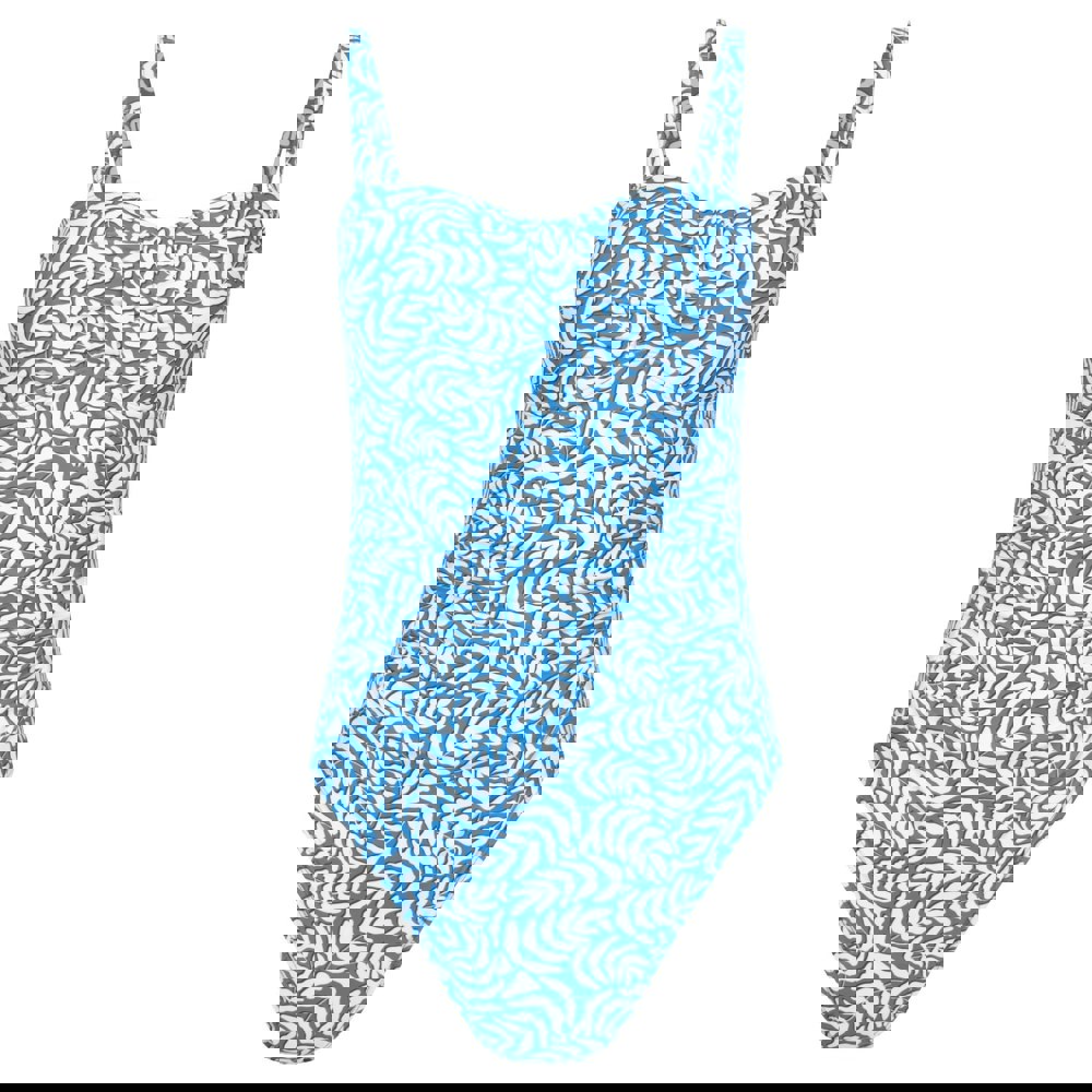 This women’s one-piece swimsuit comes in blue with an all-over printed, patterned finish. It has a pull-on fastening and a sweetheart neckline for a clean, streamlined look. Fixed cups provide structure, while the removable straps allow the style to be worn in different ways.