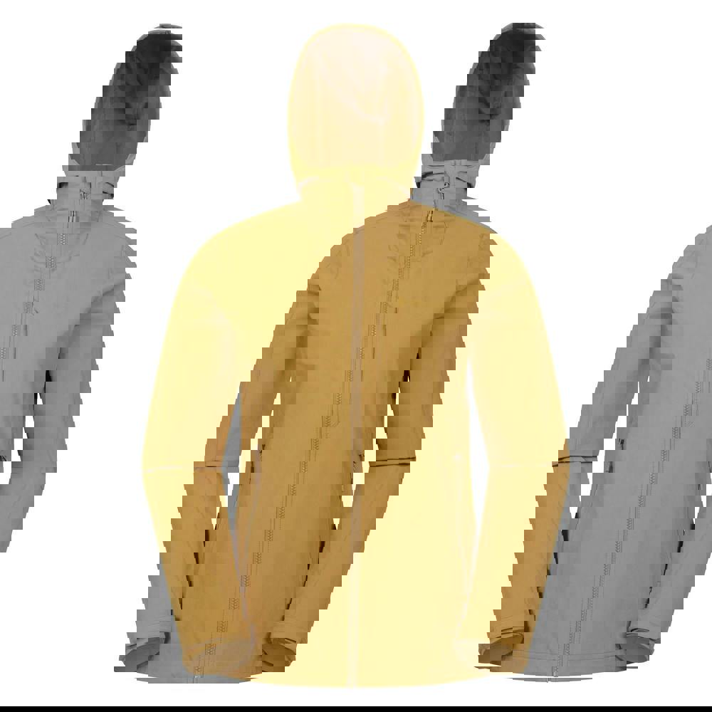 This packable soft shell jacket comes in mustard with a plain finish and logo detailing. It is lightweight and water resistant, with a DWR finish and a PFC-free construction. A hooded neckline with a standing collar adds coverage, while long sleeves and touch-fastening cuff tabs allow for an adjustable feel.