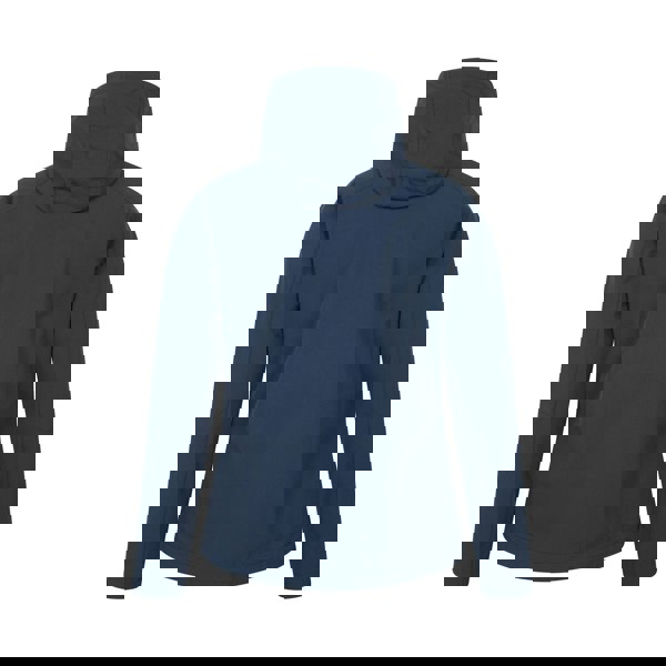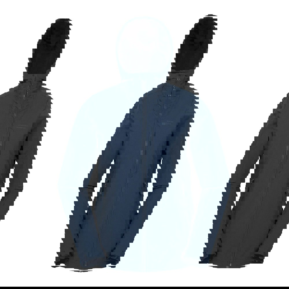 This packable soft shell jacket from Mountain Warehouse comes in navy with a plain finish and logo detailing. It has a hooded neckline with a standing collar, long sleeves and a front zip fastening for a clean, practical look.