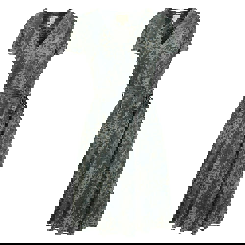 The wrap style is paired with a V neck and short sleeves for a clean, easy silhouette. Belt loops and a tie belt allow the waist to be secured neatly, keeping the look streamlined while maintaining the wrap construction.