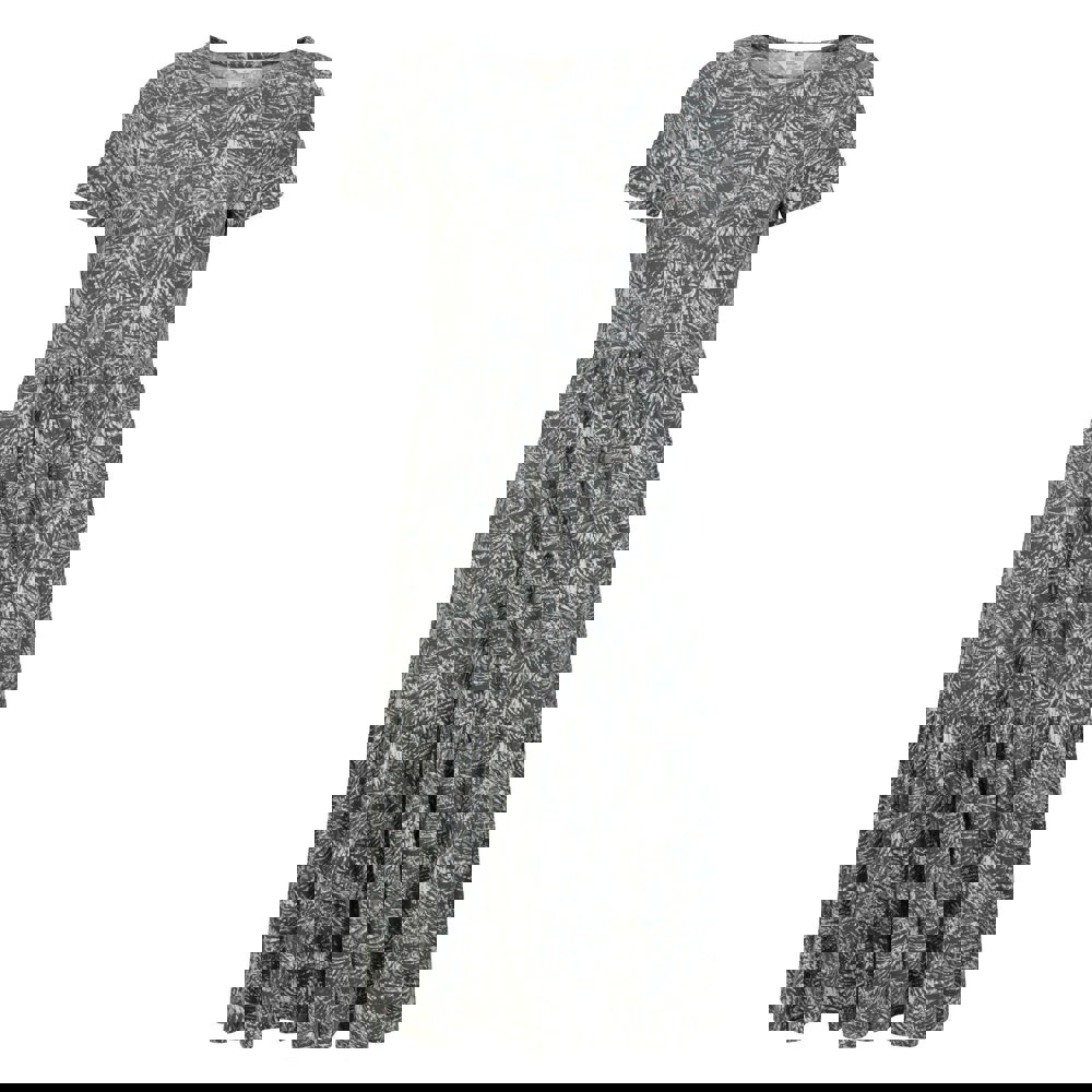 This tiered dress from Mountain Warehouse comes in khaki green with an all-over leaf print. Made from a viscose and elastane blend, it has a lightweight feel and a round neckline. The short-sleeved shape keeps the look simple and easy to wear.