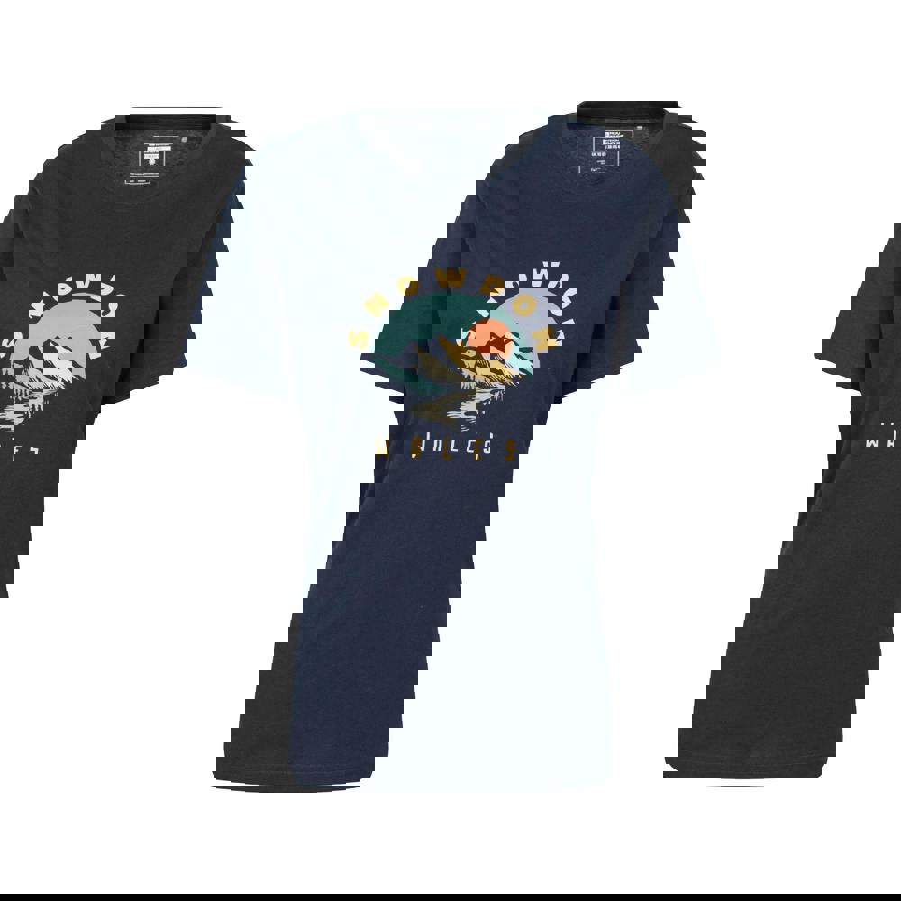 Mountain Warehouse Snowdon T-shirt in navy, cut in a relaxed fit with a classic round neckline and short sleeves. Made from 100% cotton, it has a lightweight feel and uses breathable fabric technology. The design is finished with a back print combining mountain and text details.