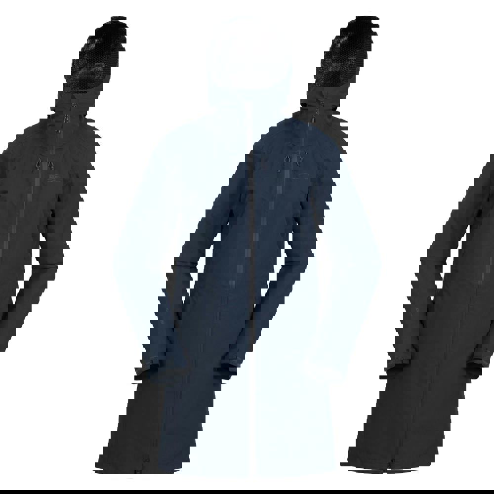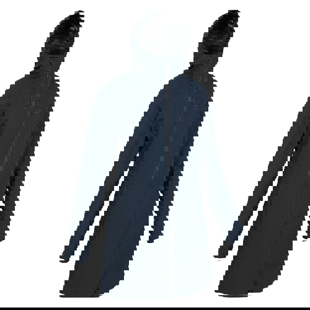 This women’s Solstice Extreme waterproof jacket from Mountain Warehouse comes in navy with a plain finish and a scooped back. It uses 2.5 layer fabric technology and is built for wet and windy conditions, with a waterproof and windproof construction and taped seams. The fabric is breathable, lightweight and durable, with a PFC-free, water-repellent finish.