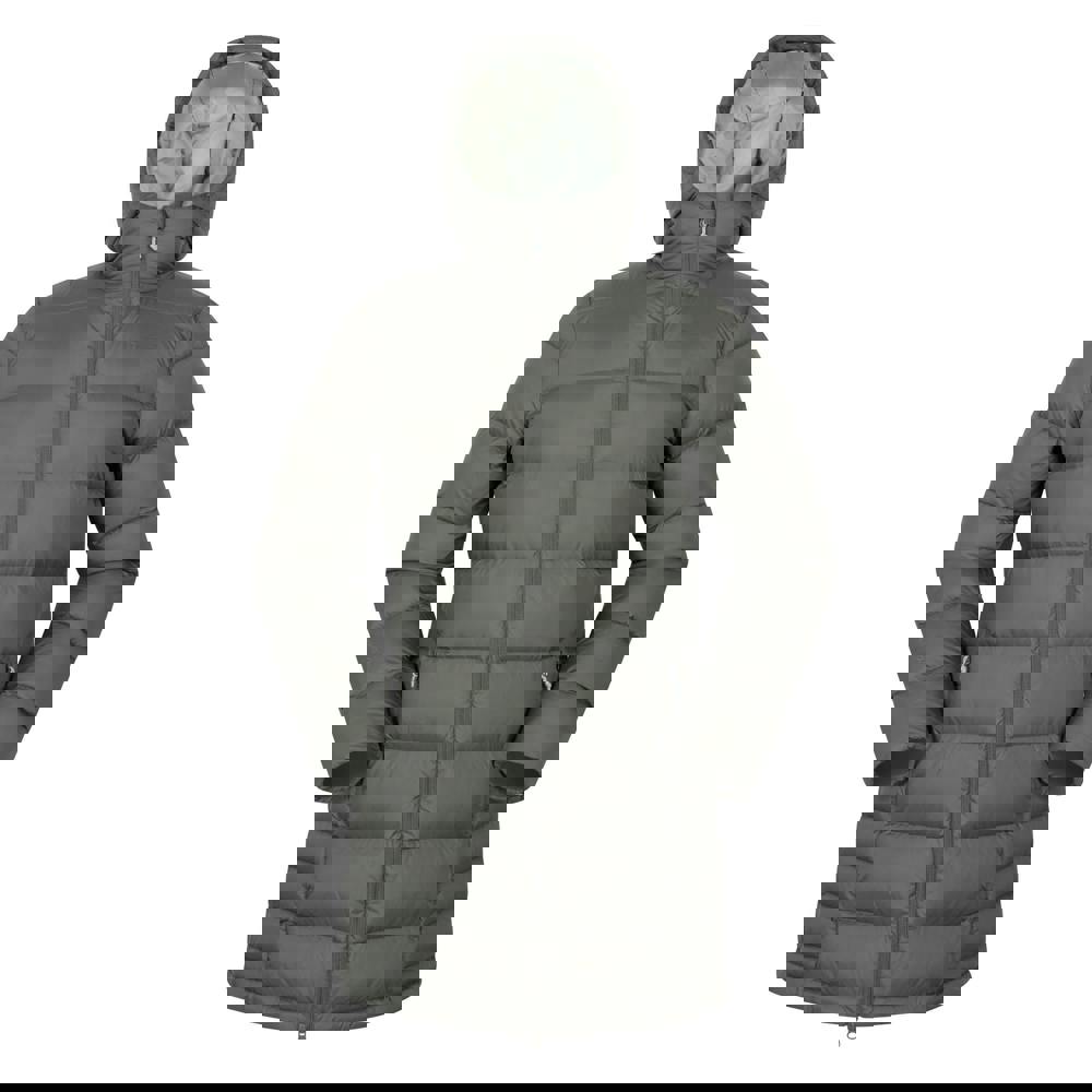 A fused stand up collar and hooded neckline add coverage, while long sleeves and a full zip fastening create a clean, practical finish. The jacket includes two side pockets with zip closure, plus a long zip pull for easier handling. Fabric technology includes water repellent and thermal tested to -30c, with insulating properties and a 700 fill power rating.