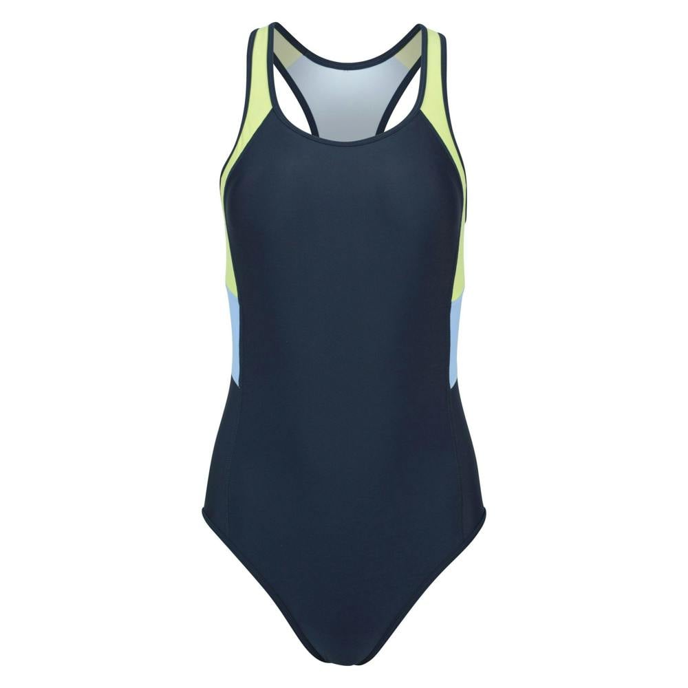 This one-piece swimsuit has a contrast design and a round neckline. It pulls on for a clean, simple finish and includes an inner bra shelf for added structure. Removable bust pads allow the fit and shape to be adjusted as needed.