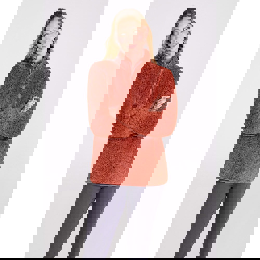 This women’s teddy fleece top from Mountain Warehouse is made from 100% polyester with a borg, teddy fleece texture. Finished in a plain burnt orange colourway, it offers a lightweight feel with anti-pilling fabric technology and a supersoft handle.