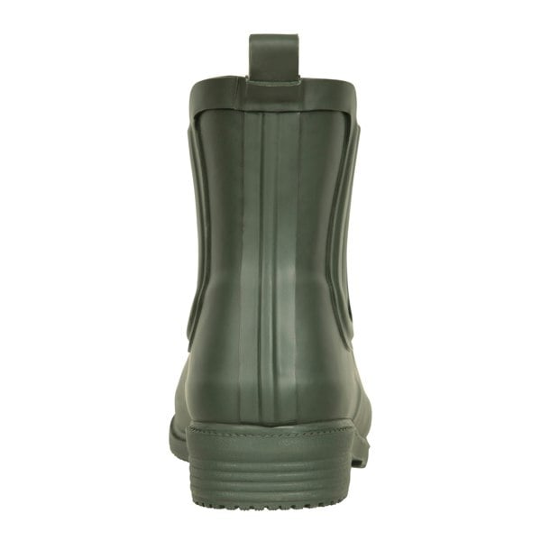 These women’s winter wellington boots come in khaki green with a plain finish and an ankle cut. The upper combines rubber and synthetic materials, with a round toe and a slip-on fastening for straightforward wear. A low heel keeps the profile simple and practical.