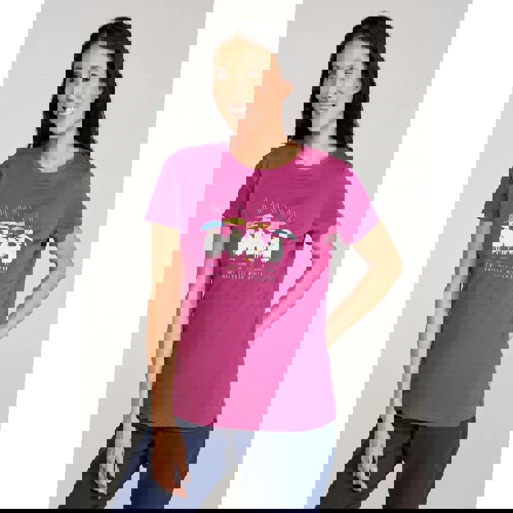 This purple Great British Weather T-shirt from Mountain Warehouse is made from organic cotton with added elastane. It has a crew neckline and short sleeves for a clean, casual shape. The printed design combines sheep, text and an umbrella motif.