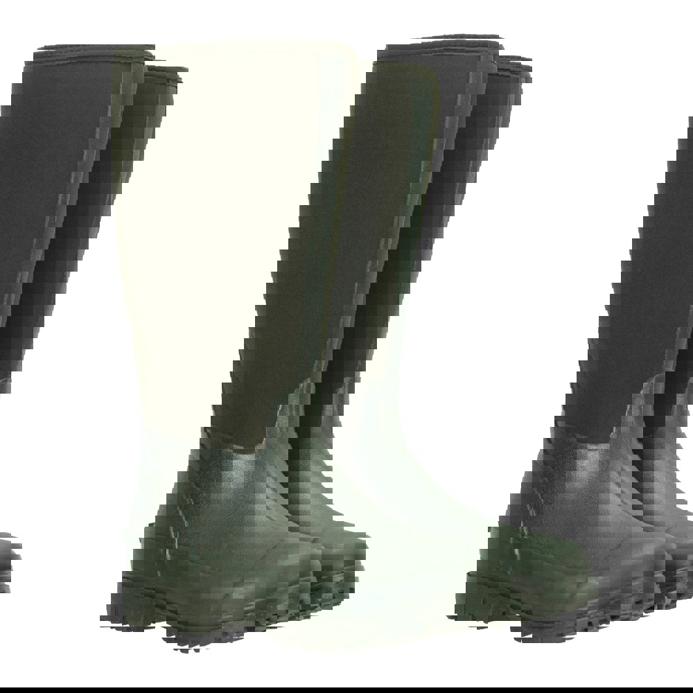 These calf-length neoprene boots offer a plain finish in green with a round toe and flat heel. The pull-on design keeps the profile clean and simple, making them easy to slip on and off.