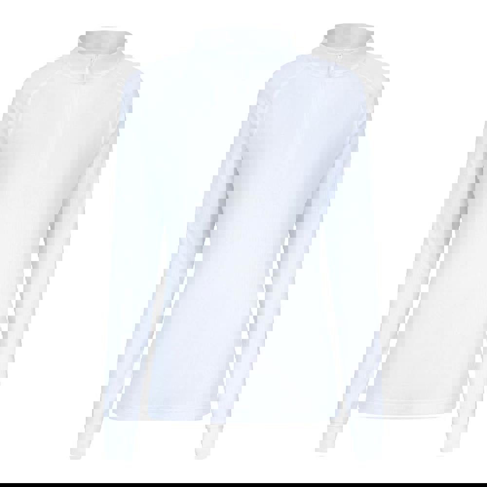 This Talus zip neck thermal top from Mountain Warehouse is made from 100% polyester and finished in white. It has a ribbed effect and long sleeves, with a standing collar and zip neck for a clean, practical neckline.