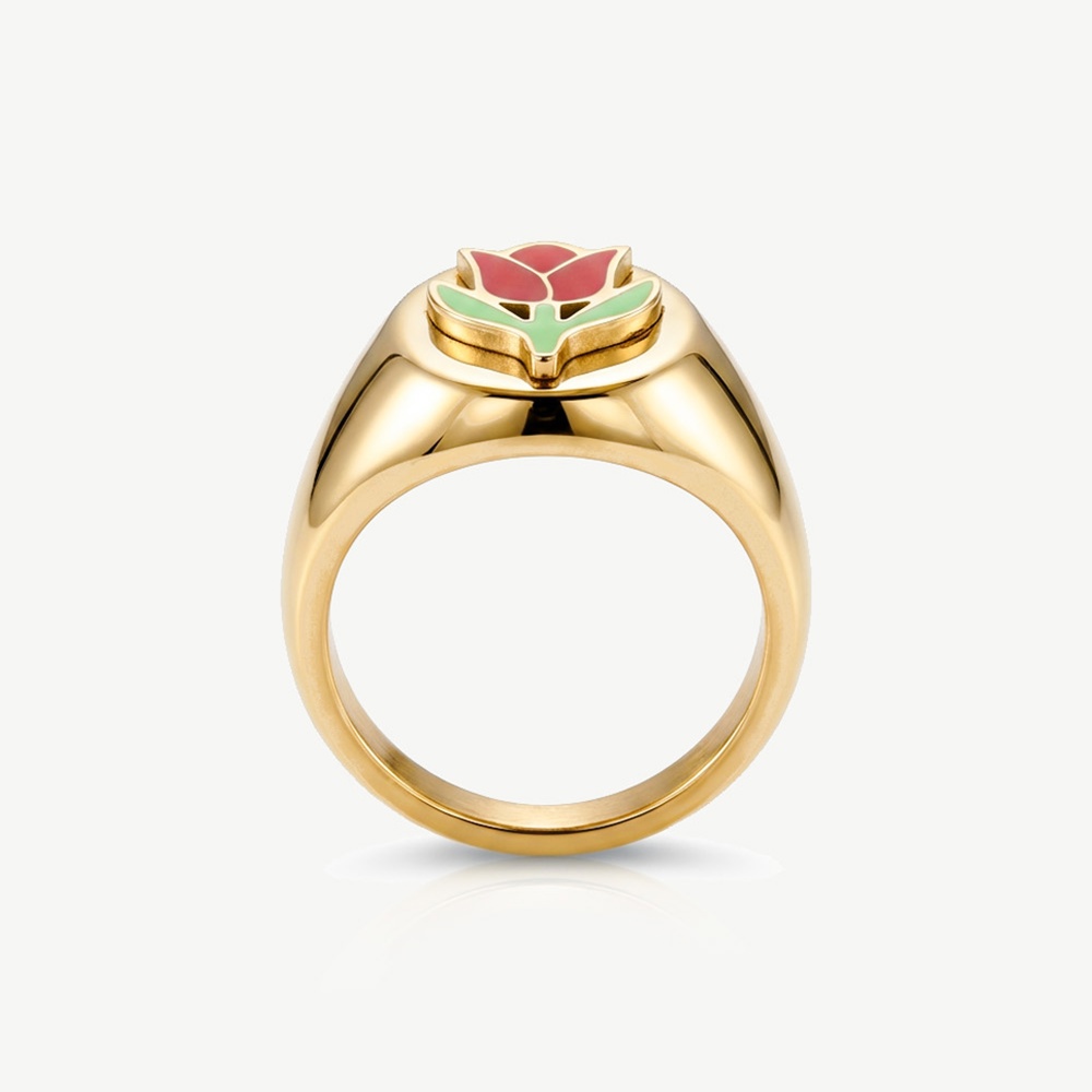 This gold signet ring features a classic face finished with a deep red rose and green enamel leaves. It stands out just enough to make simple outfits feel styled.