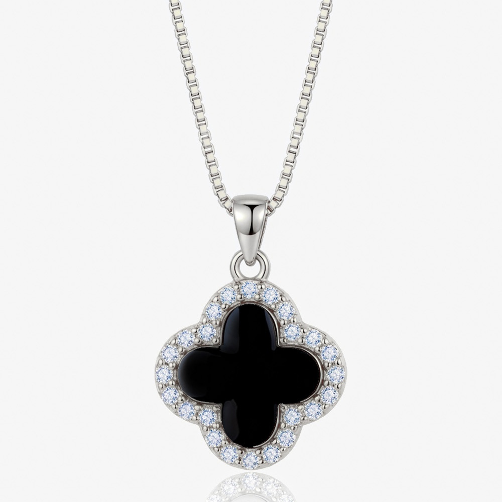 Our black clover necklace features a glossy black enamel with sparkling diamond-like stones.