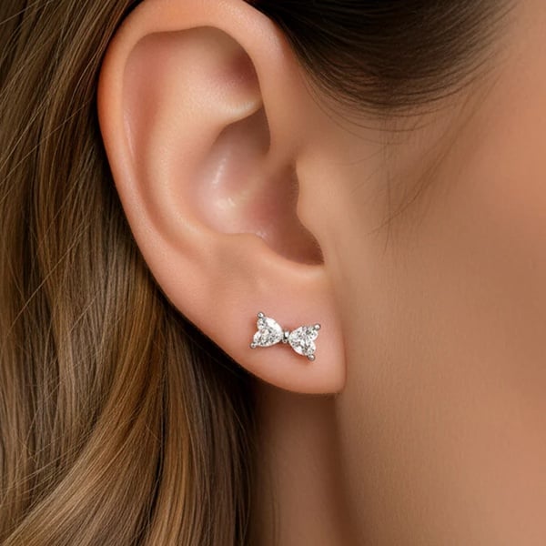 These dainty bow studs in gold or silver are made from two heart-cut cubic zirconia stones that form a delicate bow shape. They add a soft, pretty detail without looking dressy or overdone — the kind of little earrings that just make your ear stack look finished.