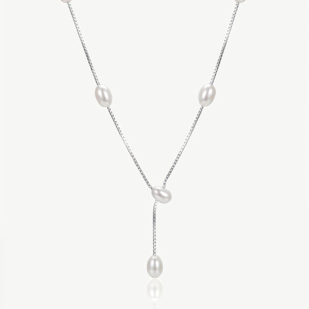 • Metal: Rhodium plated 925 sterling silver • Stones: Freshwater-style pearls • Length: 40cm necklace with lariat-style drop • Chain type: Fine box chain • Lightweight & elegant • Hypoallergenic