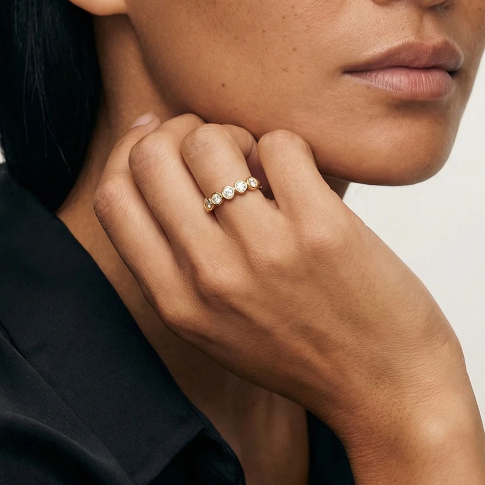 Details • Metal: 18k gold-plated 925 sterling silver • Stones: Genuine Moissanite stones • Stone size: 3mm each • Smooth bezel setting • Comfortable, low-profile band • Hypoallergenic & water-safe • Perfect for stacking or solo wear