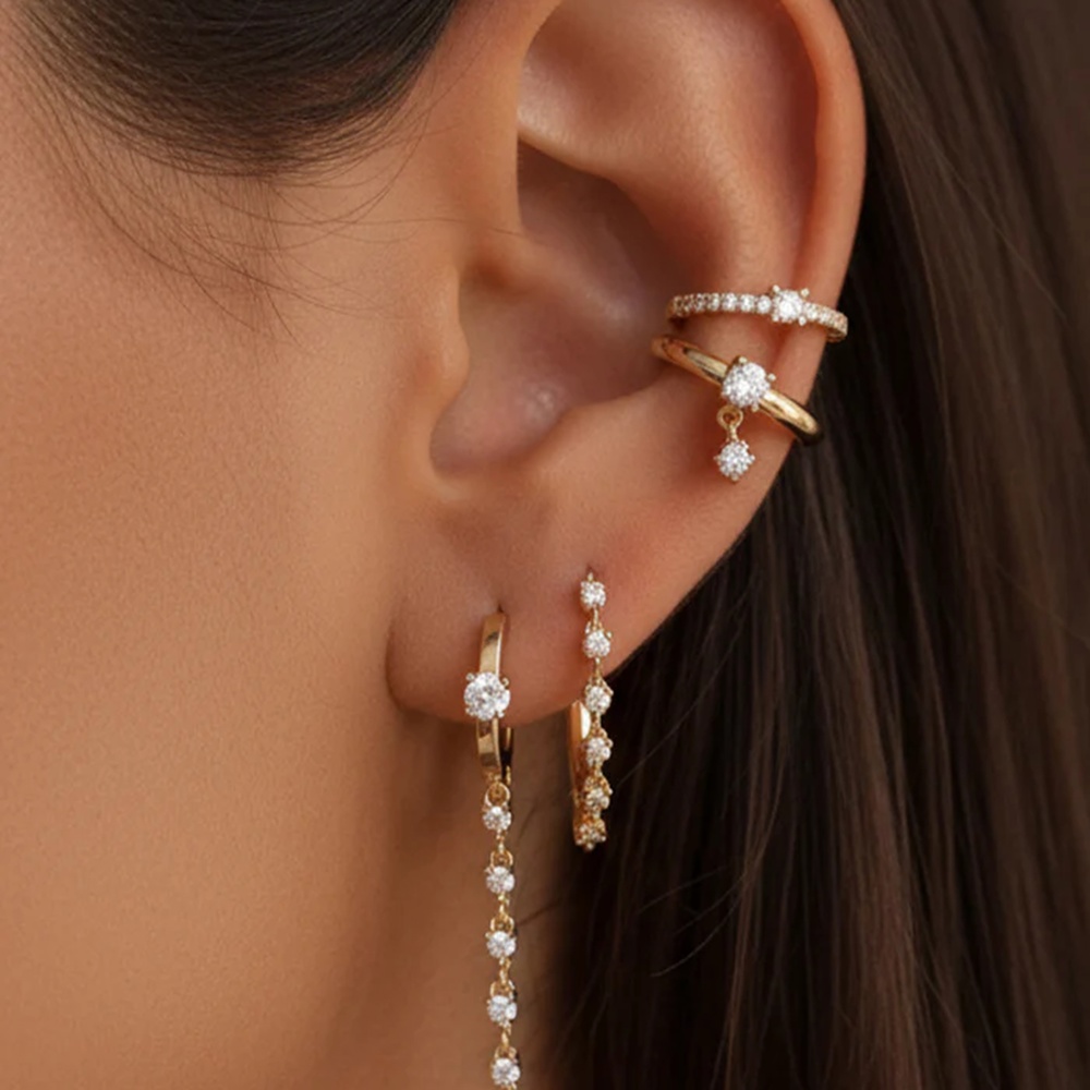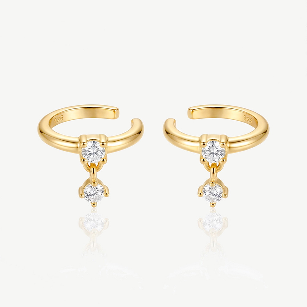 These gold ear cuffs feature a smooth polished hoop with two small cubic zirconia stones that catch the light softly. Subtle but noticeable, they add that extra detail that makes your ears look styled without feeling too sparkly or overdone.