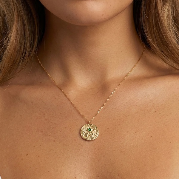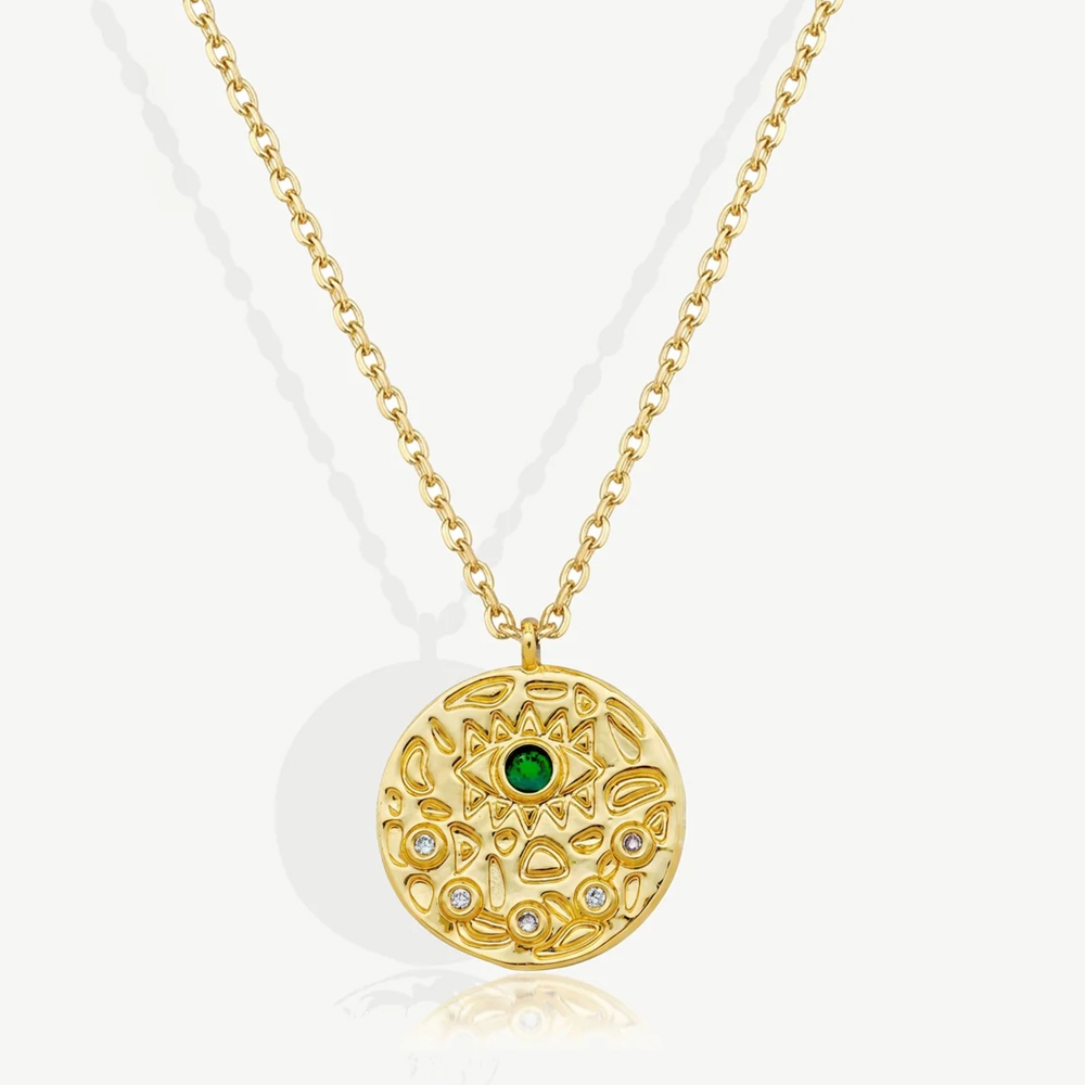 This evil eye coin necklace features a textured round pendant with a deep emerald green eye at the centre