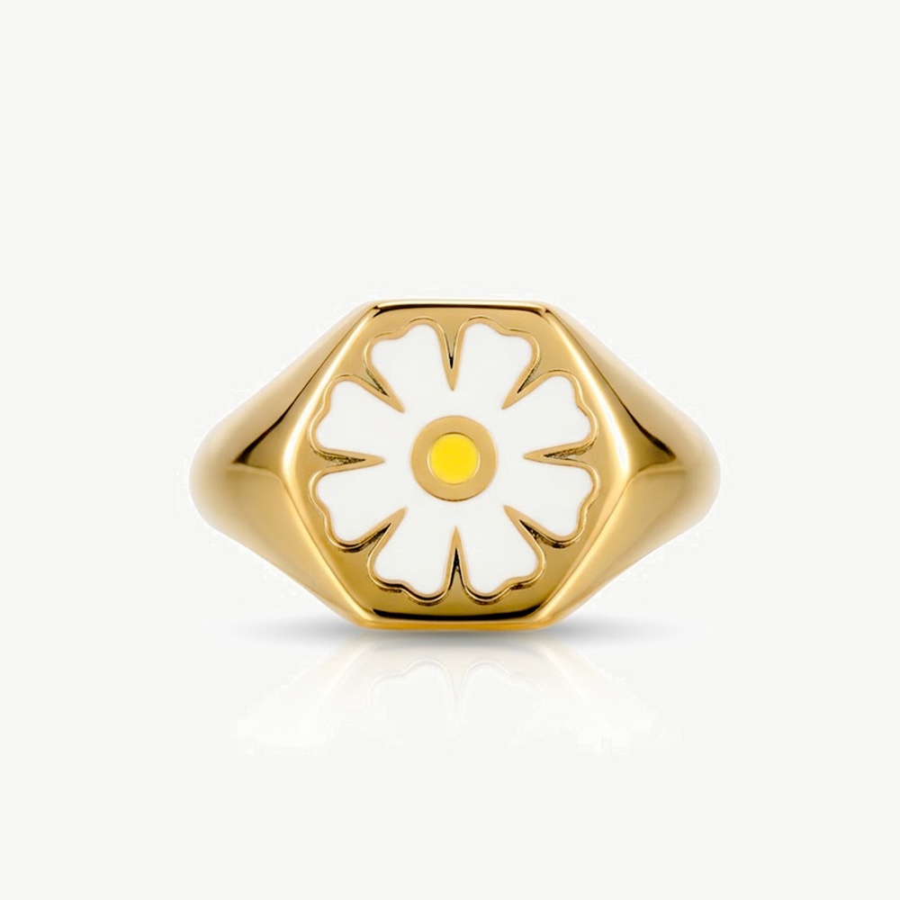 Fun. Bold. Effortless. This oversized gold signet ring features a glossy white daisy set into a smooth hexagon face. It’s the kind of ring that does all the work for you. Throw it on with jeans and a tee, tailoring, knitwear, holiday outfits or an all-black look — and suddenly everything feels more styled.