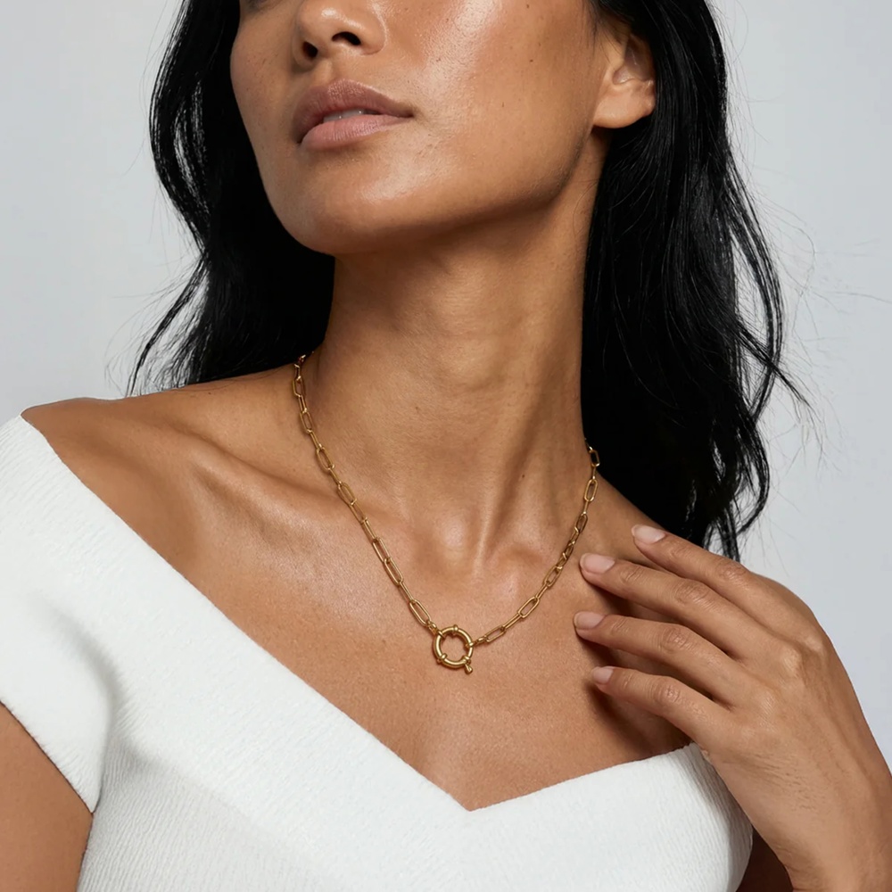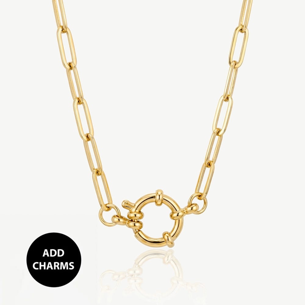 Link chain necklace featuring a classic design paired with a Q-clasp at the front, which opens to attach your favourite charms. Crafted from durable stainless steel and plated with 18k solid gold, this chain is waterproof, tarnish-resistant and hypoallergenic.