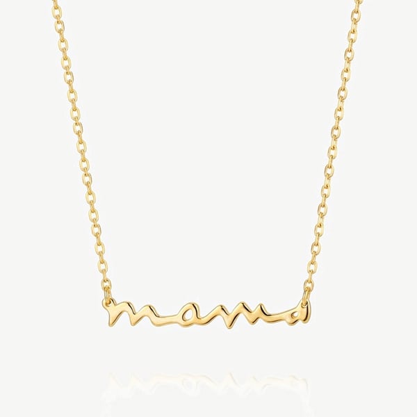 • Metal: Choose from 18k solid gold plated 925 sterling silver or solid 925 sterling silver • Polished “mama” script pendant (approx. 2.4cm × 3mm) • Chain length: 44.5cm • Hypoallergenic