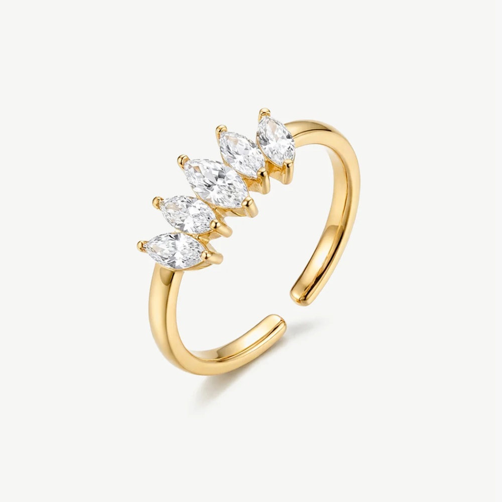 This dainty open ring features five slim marquise-cut cubic zirconia stones set in a soft crown shape. It catches the light when you move your hands but never feels too dressy or over the top.