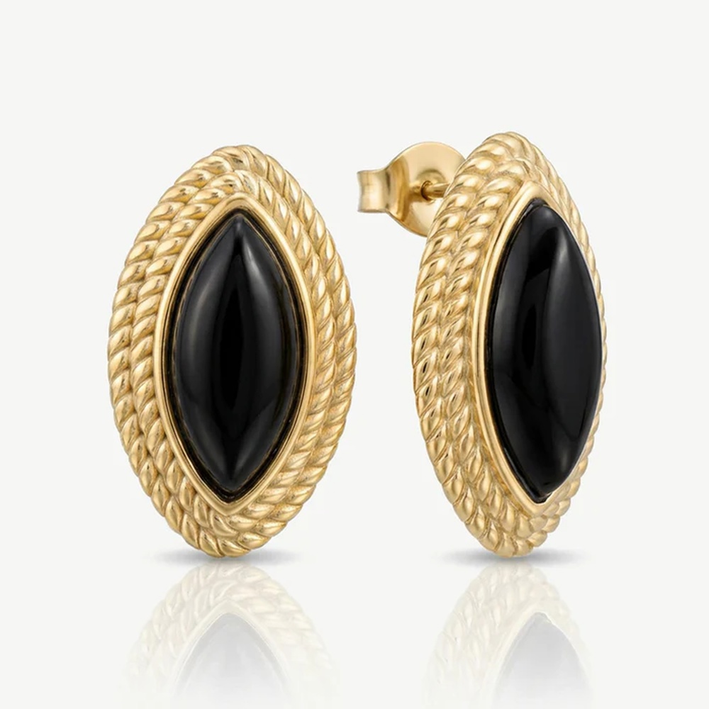These oval stud earrings feature a sculpted marquise shape with textured rope detailing and a deep black centre stone that adds contrast and depth. They stand out without feeling over the top — strong, clean, and effortless.