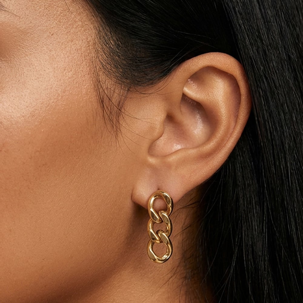 These minimalist drop earrings feature three slim chain links that move gently as you walk, catching the light in a soft, subtle way. Simple but eye-catching — the kind of pair that instantly pulls everything together without feeling too dressy.
