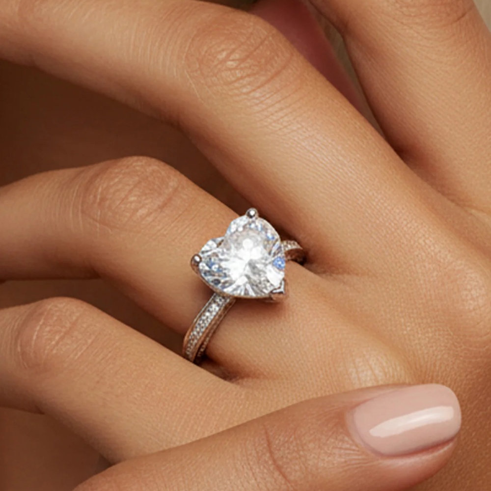 • Solid 925 sterling silver • Large heart-cut cubic zirconia centre stone • Pavé cubic zirconia detailing on the band • Lightweight and comfortable fit • Hypoallergenic