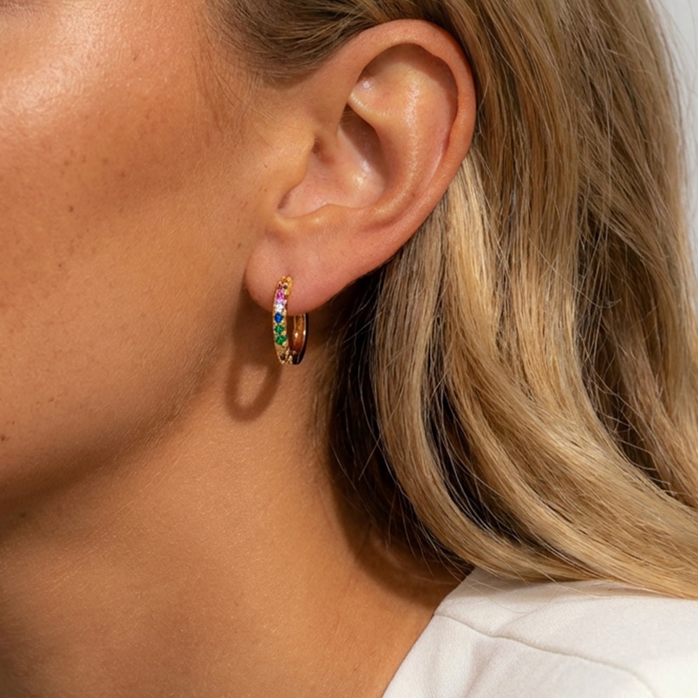 These small rainbow hoops are the easiest way to brighten your look without overthinking it. Tiny multicolour stones catch the light softly as you move, adding just enough sparkle to make simple outfits feel more fun and put together.
