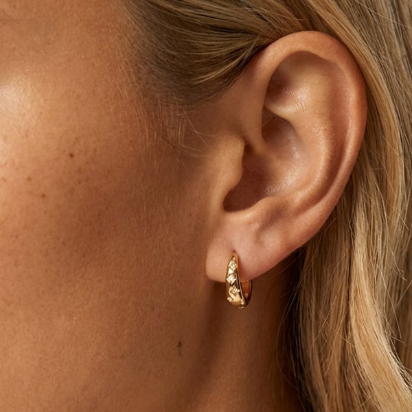 These dainty star-engraved huggie earrings sit close to the ear with tiny cubic zirconia stones set into each star, catching the light in a soft, subtle way. Not overly sparkly, not dressy — just enough to make your hair-up, no-makeup, jeans-and-jumper days feel a bit more put together.