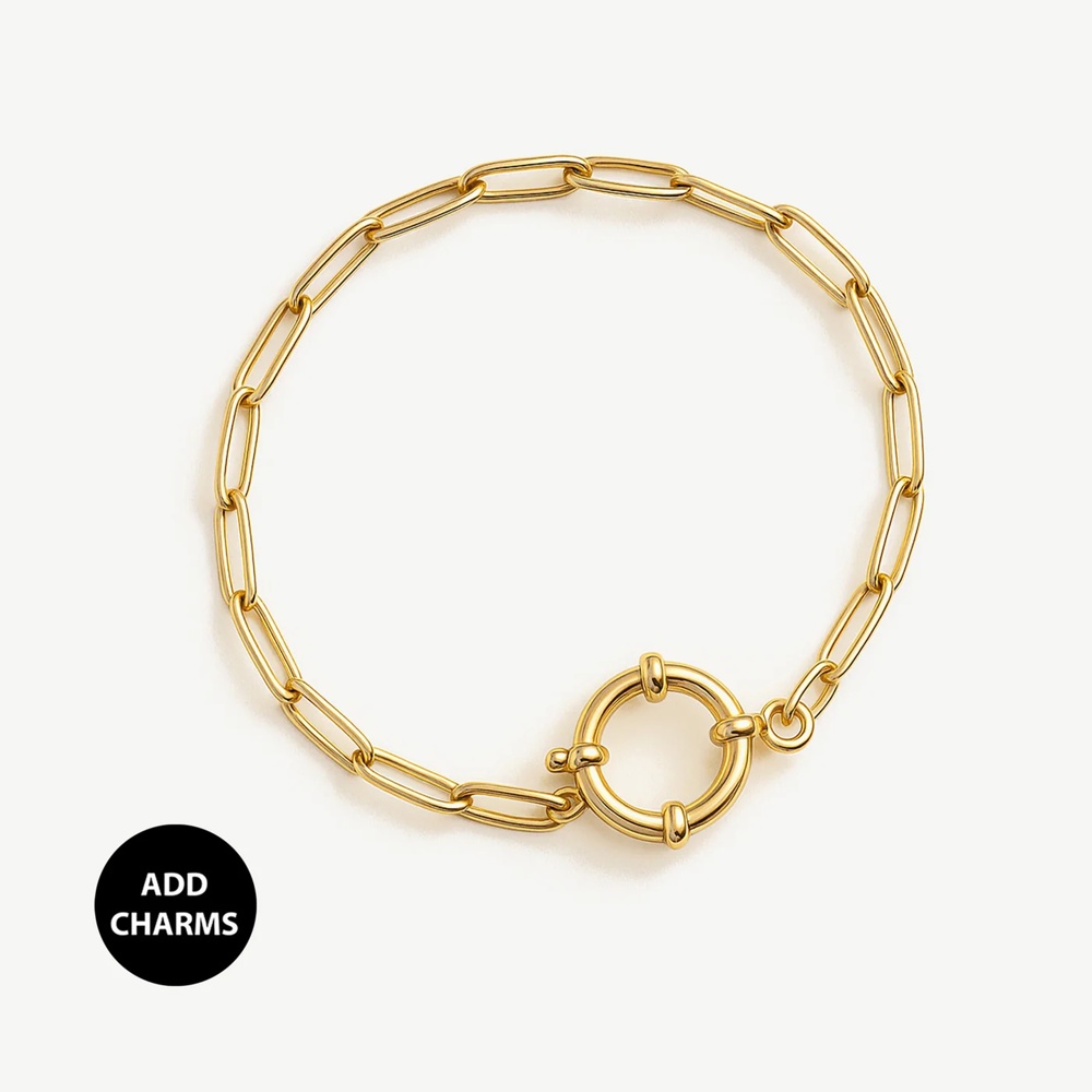 This gold link chain bracelet is designed as the perfect base for your charm collection. Featuring a distinctive sailor clasp at the front, it opens easily so you can add, remove and switch charms in seconds.