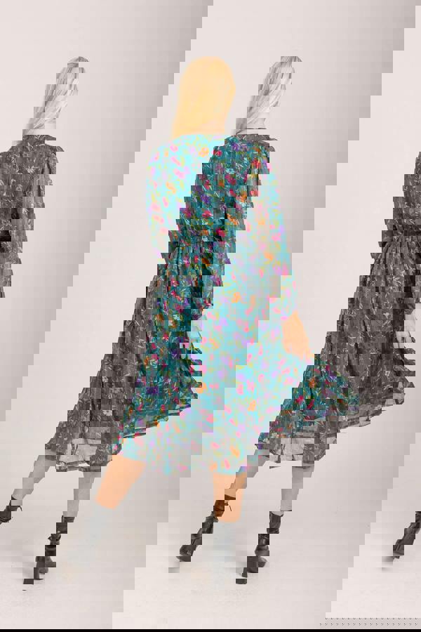 Our Floral Lurex Dress brings a blend of vintage charm and modern style to your wardrobe. Designed with a vibrant floral pattern finished with an elasticated waist finished with flattering plaits and sleeves. The flowing midi-length skirt moves beautifully, making this dress perfect for both casual outings as well as dressed-up occasions.
