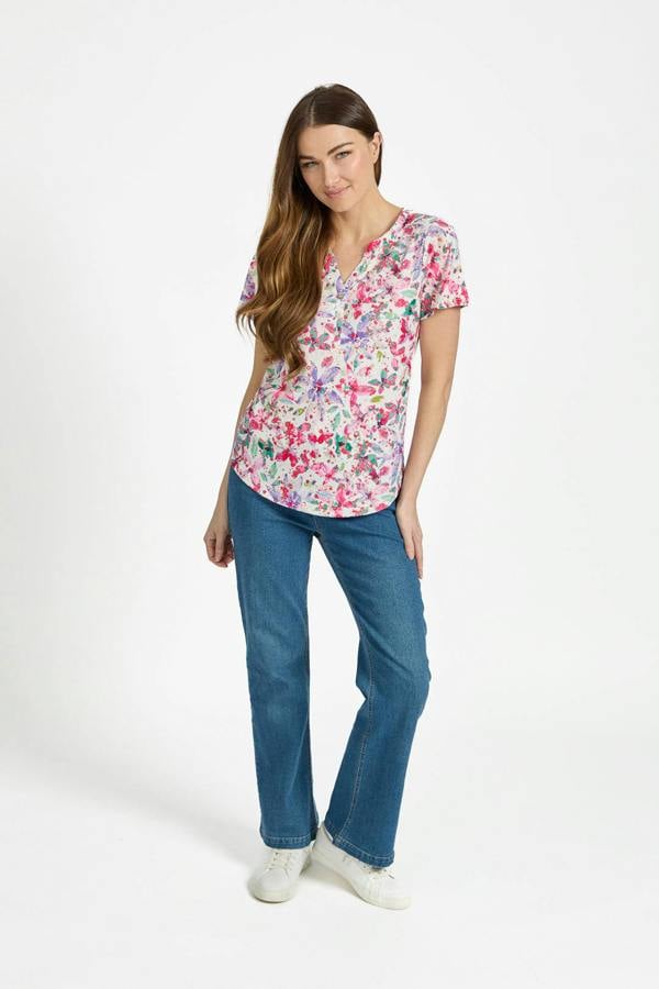 Refresh your wardrobe with this charming Floral V-Neck Button Top, designed for effortless style and everyday comfort. Made from a soft, stretchy fabric, it offers a flattering fit that moves with you. The elegant V-neckline and functional button-front detail add a feminine touch, while the vibrant floral print gives it a fresh, timeless appeal.