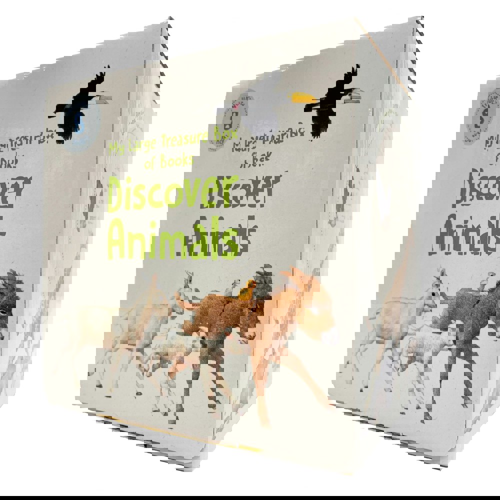 My Large Treasure Box of Books: Discover Animals is a collection of eight illustrated books that invites young children to play along while discovering animals. The set takes little ones to a range of familiar settings, including the garden, by the lake, at the farm, and at the zoo.