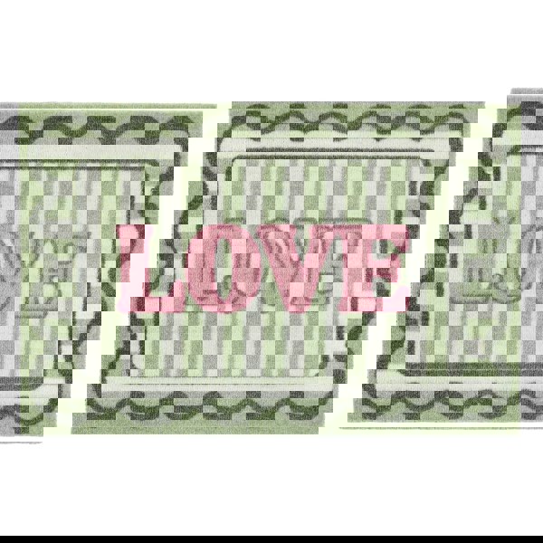 My Mat My Love features a ‘love’ message in pink on a green and white striped background with a dark green wavy border