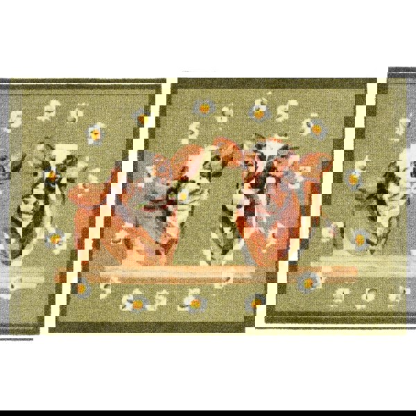 My Mat Daisy Cow features two happy cows surrounded by a ring of daisies on a light green background surrounded by a dark green border, whilst the runner features an array of Daisy Flowers on a light green background with a dark green border