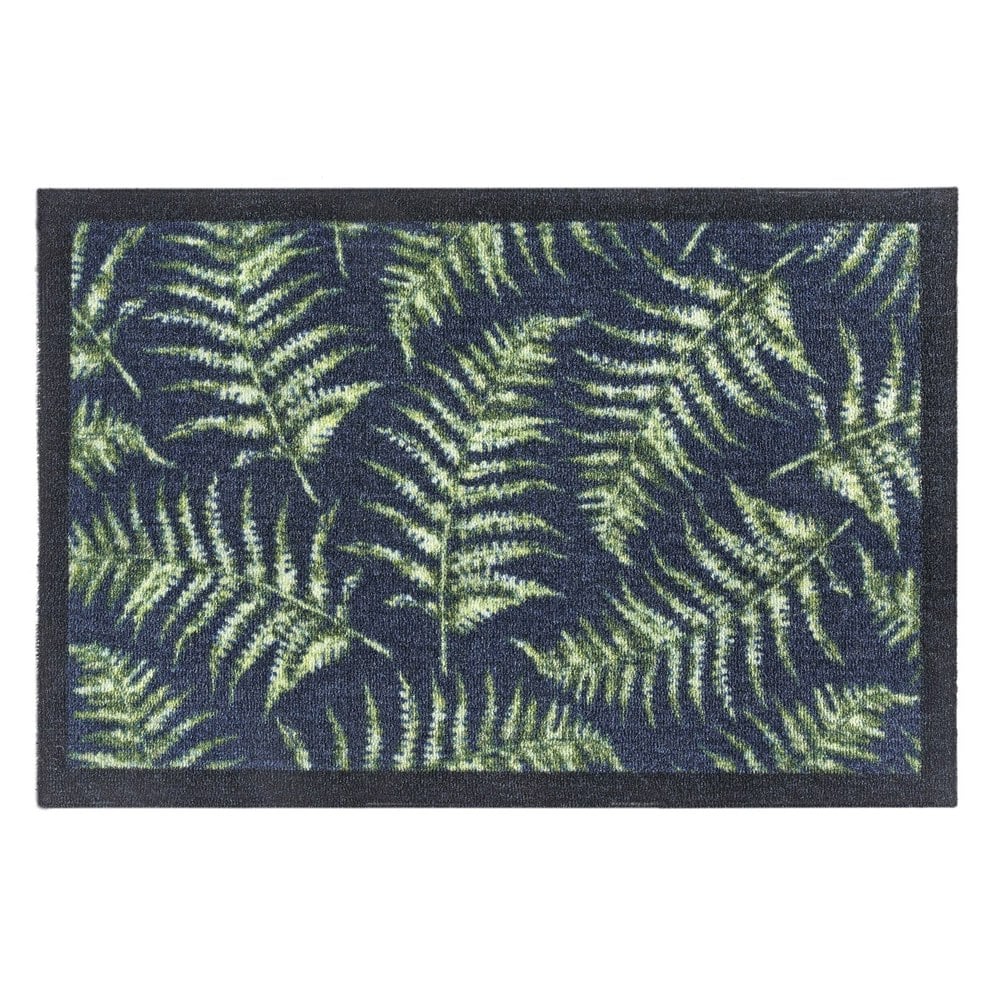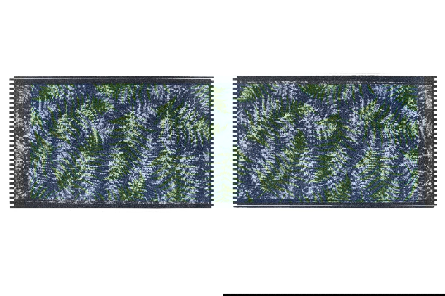 My Mat Nylon Fern Leaves design features green fern leaves in a repeating design on a dark blue background with a black border